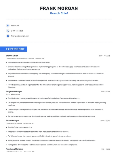 Build a professional branch chief resume in minutes. Browse through our resume examples to identify the best way to word your resume. Then choose from 5+ resume templates to create your branch chief resume.