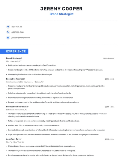 Build a professional brand strategist resume in minutes. Browse through our resume examples to identify the best way to word your resume. Then choose from 5+ resume templates to create your brand strategist resume.