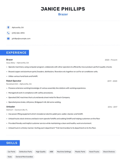 Build a professional brazer resume in minutes. Browse through our resume examples to identify the best way to word your resume. Then choose from 5+ resume templates to create your brazer resume.