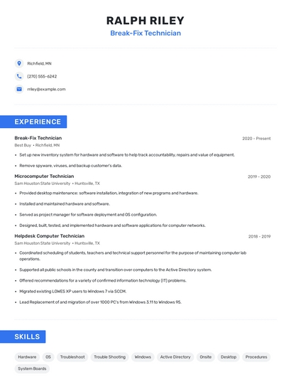 Build a professional break-fix technician resume in minutes. Browse through our resume examples to identify the best way to word your resume. Then choose from 5+ resume templates to create your break-fix technician resume.