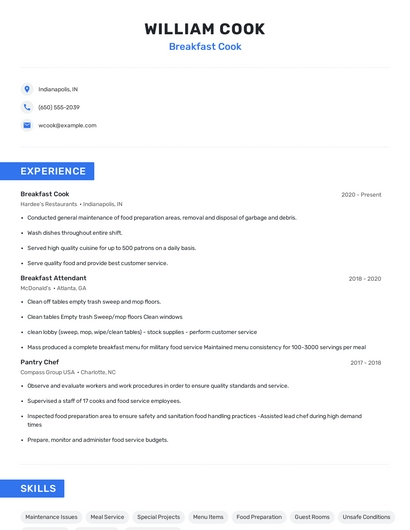 Build a professional breakfast cook resume in minutes. Browse through our resume examples to identify the best way to word your resume. Then choose from 5+ resume templates to create your breakfast cook resume.