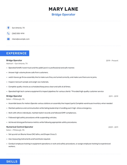 Build a professional bridge operator resume in minutes. Browse through our resume examples to identify the best way to word your resume. Then choose from 5+ resume templates to create your bridge operator resume.