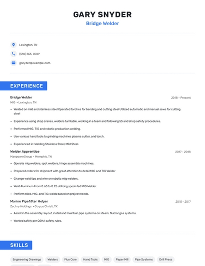 The most important skills for a bridge welder resume and required skills for a bridge welder to have include: