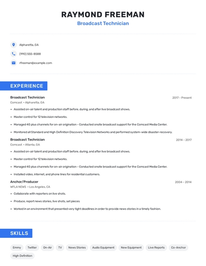 Build a professional broadcast technician resume in minutes. Browse through our resume examples to identify the best way to word your resume. Then choose from 5+ resume templates to create your broadcast technician resume.