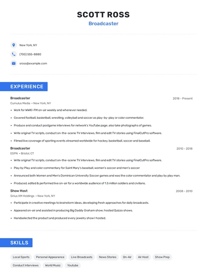 Build a professional broadcaster resume in minutes. Browse through our resume examples to identify the best way to word your resume. Then choose from 5+ resume templates to create your broadcaster resume.