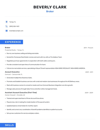 Build a professional broker resume in minutes. Browse through our resume examples to identify the best way to word your resume. Then choose from 5+ resume templates to create your broker resume.
