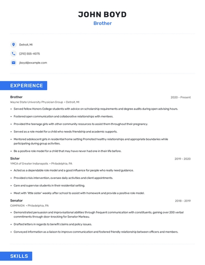 Build a professional brother resume in minutes. Our AI resume writing assistant will guide you through every step of the process, and you can choose from 10+ resume templates to create your brother resume.7. Executive Board
