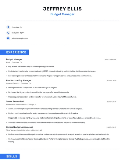 Build a professional budget manager resume in minutes. Browse through our resume examples to identify the best way to word your resume. Then choose from 5+ resume templates to create your budget manager resume.