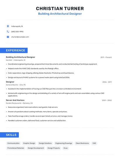 Build a professional building architectural designer resume in minutes. Browse through our resume examples to identify the best way to word your resume. Then choose from 5+ resume templates to create your building architectural designer resume.