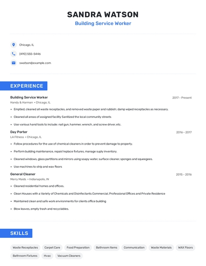 Build a professional building service worker resume in minutes. Browse through our resume examples to identify the best way to word your resume. Then choose from 5+ resume templates to create your building service worker resume.