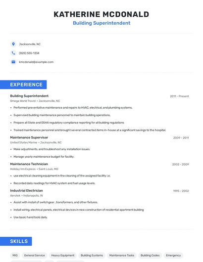 Build a professional building superintendent resume in minutes. Browse through our resume examples to identify the best way to word your resume. Then choose from 5+ resume templates to create your building superintendent resume.