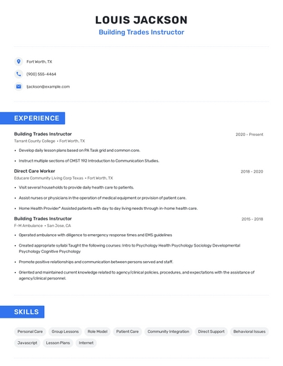 Build a professional building trades instructor resume in minutes. Our AI resume writing assistant will guide you through every step of the process, and you can choose from 10+ resume templates to create your building trades instructor resume.7. Skill Building