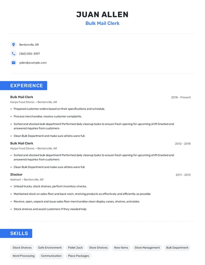 Build a professional bulk mail clerk resume in minutes. Our AI resume writing assistant will guide you through every step of the process, and you can choose from 10+ resume templates to create your bulk mail clerk resume.What skills help Bulk Mail Clerks find jobs?