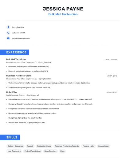 The most important skills for a bulk mail technician resume and required skills for a bulk mail technician to have include: