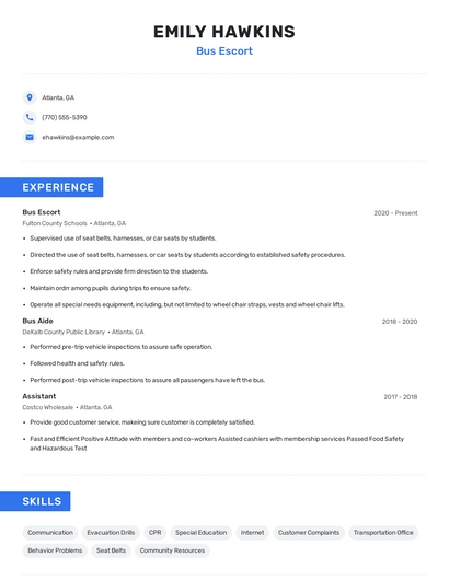 The most important skills for a bus escort resume and required skills for a bus escort to have include: