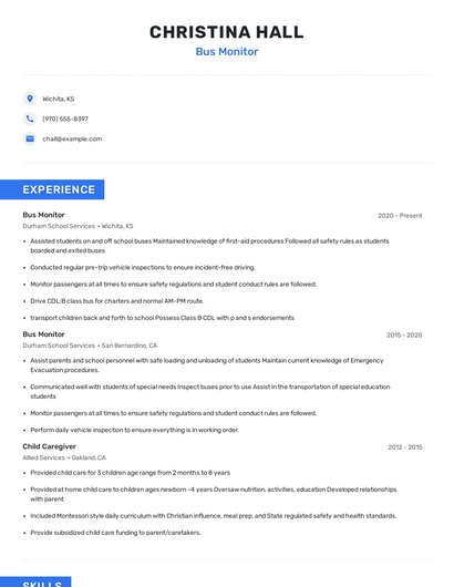 Build a professional bus monitor resume in minutes. Browse through our resume examples to identify the best way to word your resume. Then choose from 5+ resume templates to create your bus monitor resume.