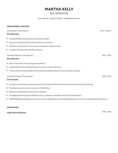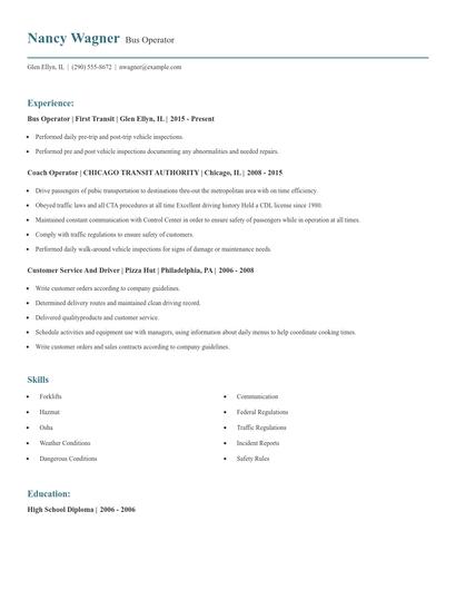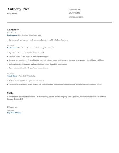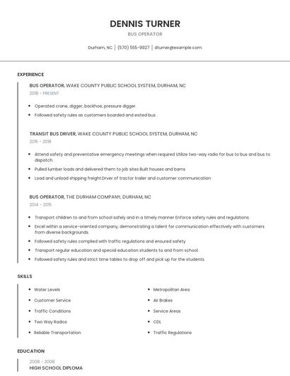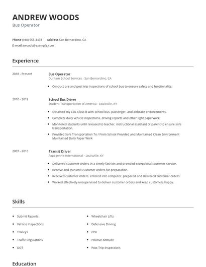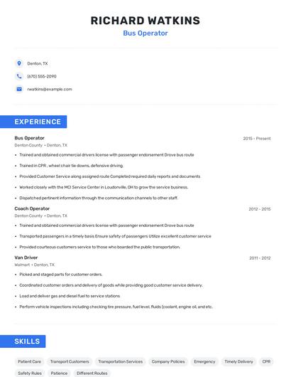 You can use Zippia's AI resume builder to make the resume writing process easier while also making sure that you include key information that hiring managers expect to see on a bus operator resume. You'll find resume tips and examples of skills, responsibilities, and summaries, all provided by Zippi, your career sidekick.