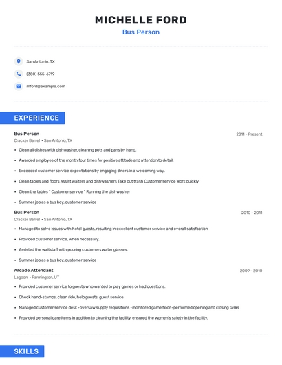 Build a professional bus person resume in minutes. Browse through our resume examples to identify the best way to word your resume. Then choose from 5+ resume templates to create your bus person resume.