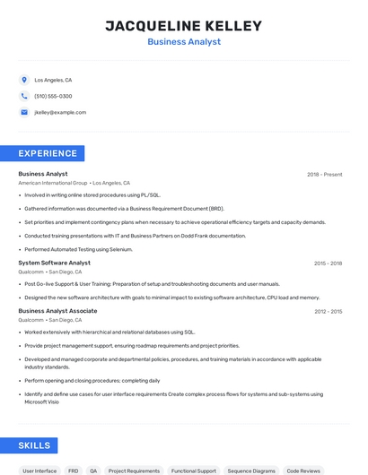 Build a professional business analyst resume in minutes. Browse through our resume examples to identify the best way to word your resume. Then choose from 5+ resume templates to create your business analyst resume.