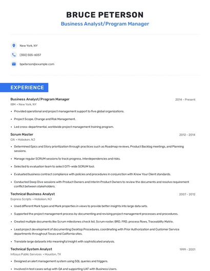 Build a professional business analyst/program manager resume in minutes. Browse through our resume examples to identify the best way to word your resume. Then choose from 5+ resume templates to create your business analyst/program manager resume.