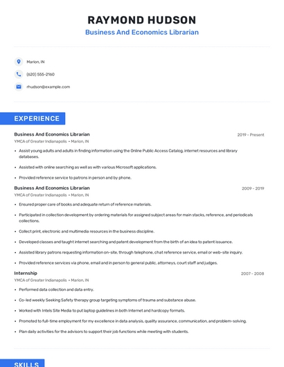 The most important skills for a business and economics librarian resume and required skills for a business and economics librarian to have include: