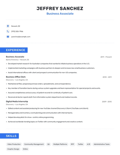 Build a professional business associate resume in minutes. Browse through our resume examples to identify the best way to word your resume. Then choose from 5+ resume templates to create your business associate resume.