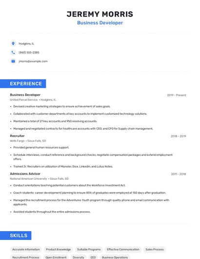 Build a professional business developer resume in minutes. Browse through our resume examples to identify the best way to word your resume. Then choose from 5+ resume templates to create your business developer resume.