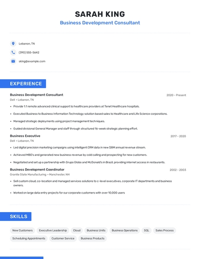 Build a professional business development consultant resume in minutes. Browse through our resume examples to identify the best way to word your resume. Then choose from 5+ resume templates to create your business development consultant resume.