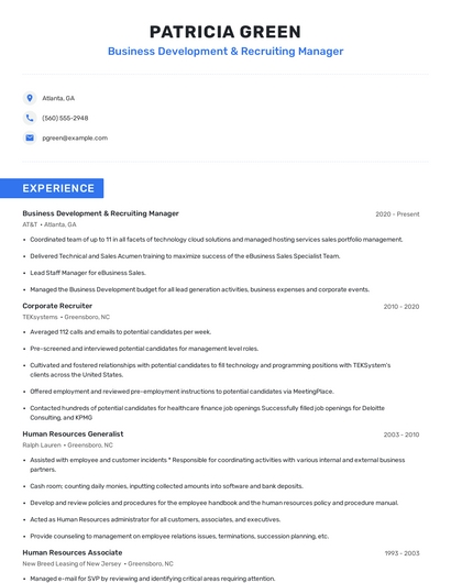Build a professional business development & recruiting manager resume in minutes. Browse through our resume examples to identify the best way to word your resume. Then choose from 5+ resume templates to create your business development & recruiting manager resume.