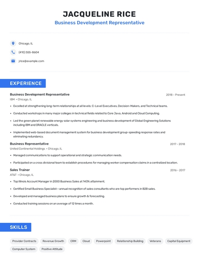 Build a professional business development representative resume in minutes. Browse through our resume examples to identify the best way to word your resume. Then choose from 5+ resume templates to create your business development representative resume.
