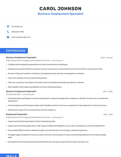 The most important skills for a business employment specialist resume and required skills for a business employment specialist to have include: