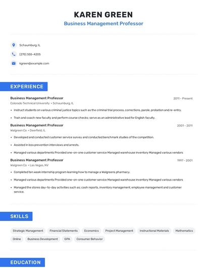 Build a professional business management professor resume in minutes. Browse through our resume examples to identify the best way to word your resume. Then choose from 5+ resume templates to create your business management professor resume.