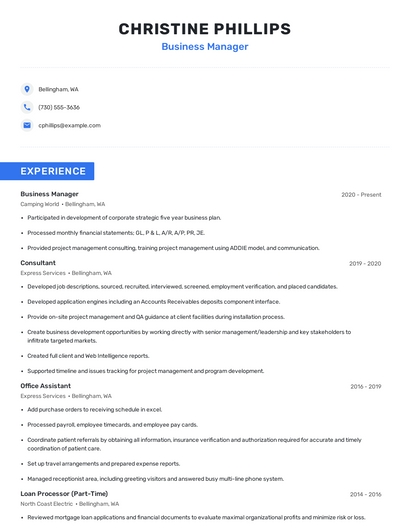 Build a professional business manager resume in minutes. Browse through our resume examples to identify the best way to word your resume. Then choose from 5+ resume templates to create your business manager resume.