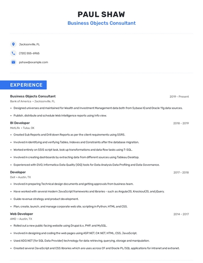 Build a professional business objects consultant resume in minutes. Browse through our resume examples to identify the best way to word your resume. Then choose from 5+ resume templates to create your business objects consultant resume.