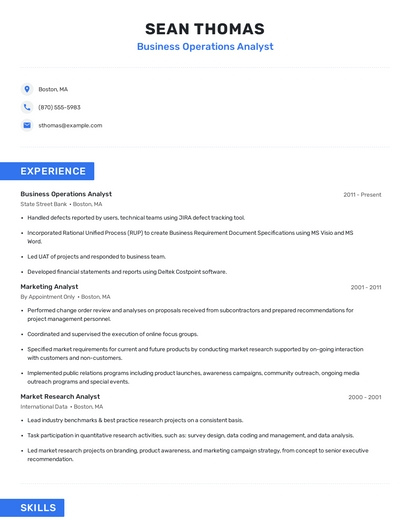 Build a professional business operations analyst resume in minutes. Browse through our resume examples to identify the best way to word your resume. Then choose from 5+ resume templates to create your business operations analyst resume.
