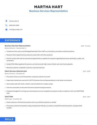 Build a professional business services representative resume in minutes. Browse through our resume examples to identify the best way to word your resume. Then choose from 5+ resume templates to create your business services representative resume.