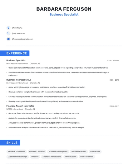 Build a professional business specialist resume in minutes. Browse through our resume examples to identify the best way to word your resume. Then choose from 5+ resume templates to create your business specialist resume.