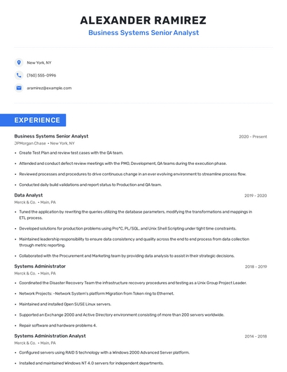 Build a professional business systems senior analyst resume in minutes. Browse through our resume examples to identify the best way to word your resume. Then choose from 5+ resume templates to create your business systems senior analyst resume.