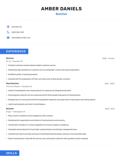 Build a professional butcher resume in minutes. Browse through our resume examples to identify the best way to word your resume. Then choose from 5+ resume templates to create your butcher resume.
