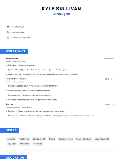 Build a professional cabin agent resume in minutes. Browse through our resume examples to identify the best way to word your resume. Then choose from 5+ resume templates to create your cabin agent resume.