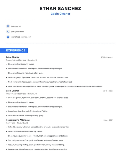 Build a professional cabin cleaner resume in minutes. Browse through our resume examples to identify the best way to word your resume. Then choose from 5+ resume templates to create your cabin cleaner resume.