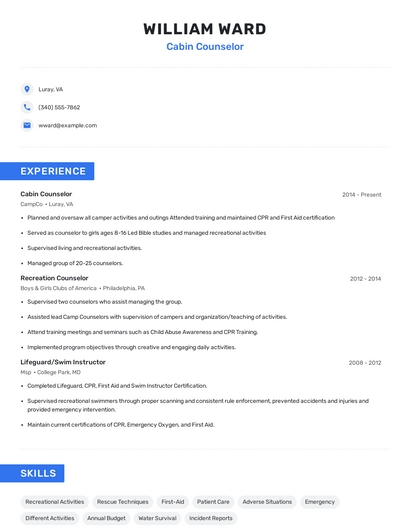 Build a professional cabin counselor resume in minutes. Browse through our resume examples to identify the best way to word your resume. Then choose from 5+ resume templates to create your cabin counselor resume.