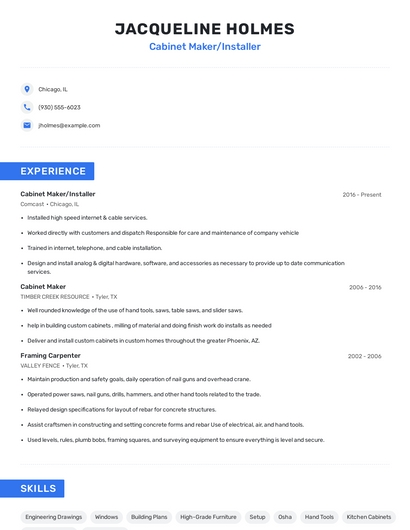 Build a professional cabinet maker/installer resume in minutes. Browse through our resume examples to identify the best way to word your resume. Then choose from 5+ resume templates to create your cabinet maker/installer resume.