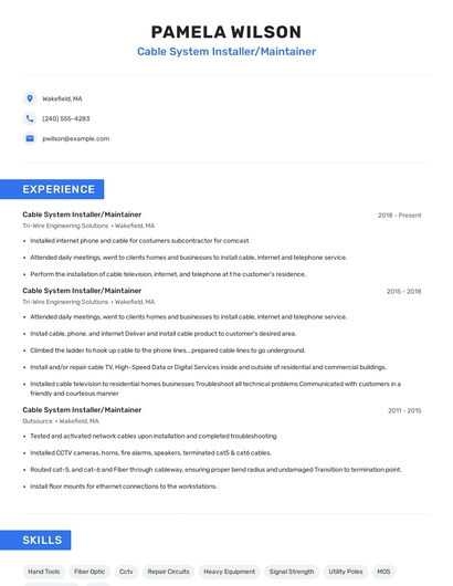 Choose from 10+ customizable cable system installer/maintainer resume templates