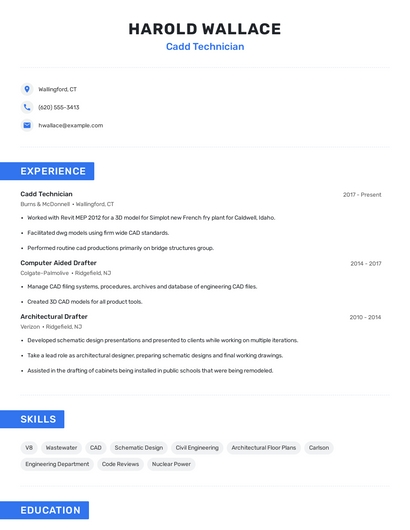 Build a professional cadd technician resume in minutes. Browse through our resume examples to identify the best way to word your resume. Then choose from 5+ resume templates to create your cadd technician resume.