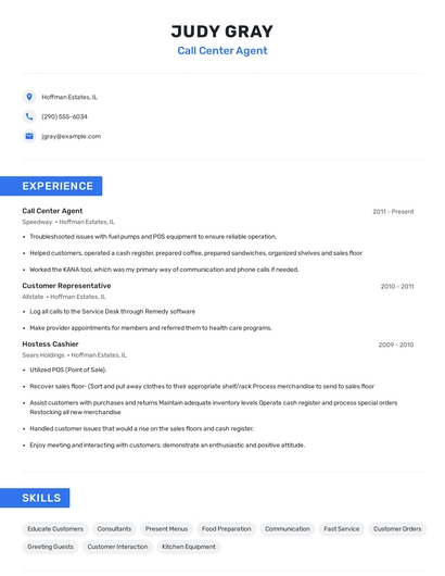 Build a professional call center agent resume in minutes. Browse through our resume examples to identify the best way to word your resume. Then choose from 5+ resume templates to create your call center agent resume.
