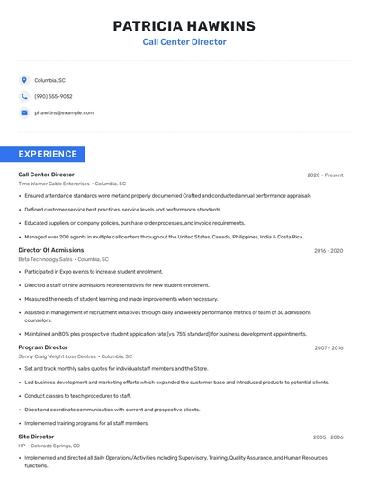 Build a professional call center director resume in minutes. Browse through our resume examples to identify the best way to word your resume. Then choose from 5+ resume templates to create your call center director resume.
