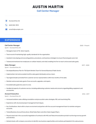 Build a professional call center manager resume in minutes. Browse through our resume examples to identify the best way to word your resume. Then choose from 5+ resume templates to create your call center manager resume.