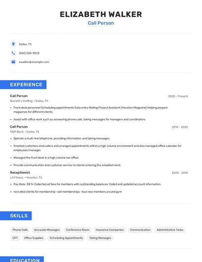 Build a professional call person resume in minutes. Our AI resume writing assistant will guide you through every step of the process, and you can choose from 10+ resume templates to create your call person resume.7. Multi