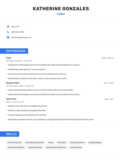 Build a professional caller resume in minutes. Browse through our resume examples to identify the best way to word your resume. Then choose from 5+ resume templates to create your caller resume.